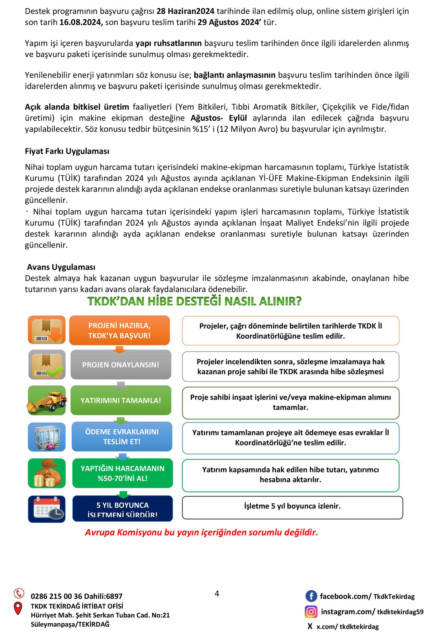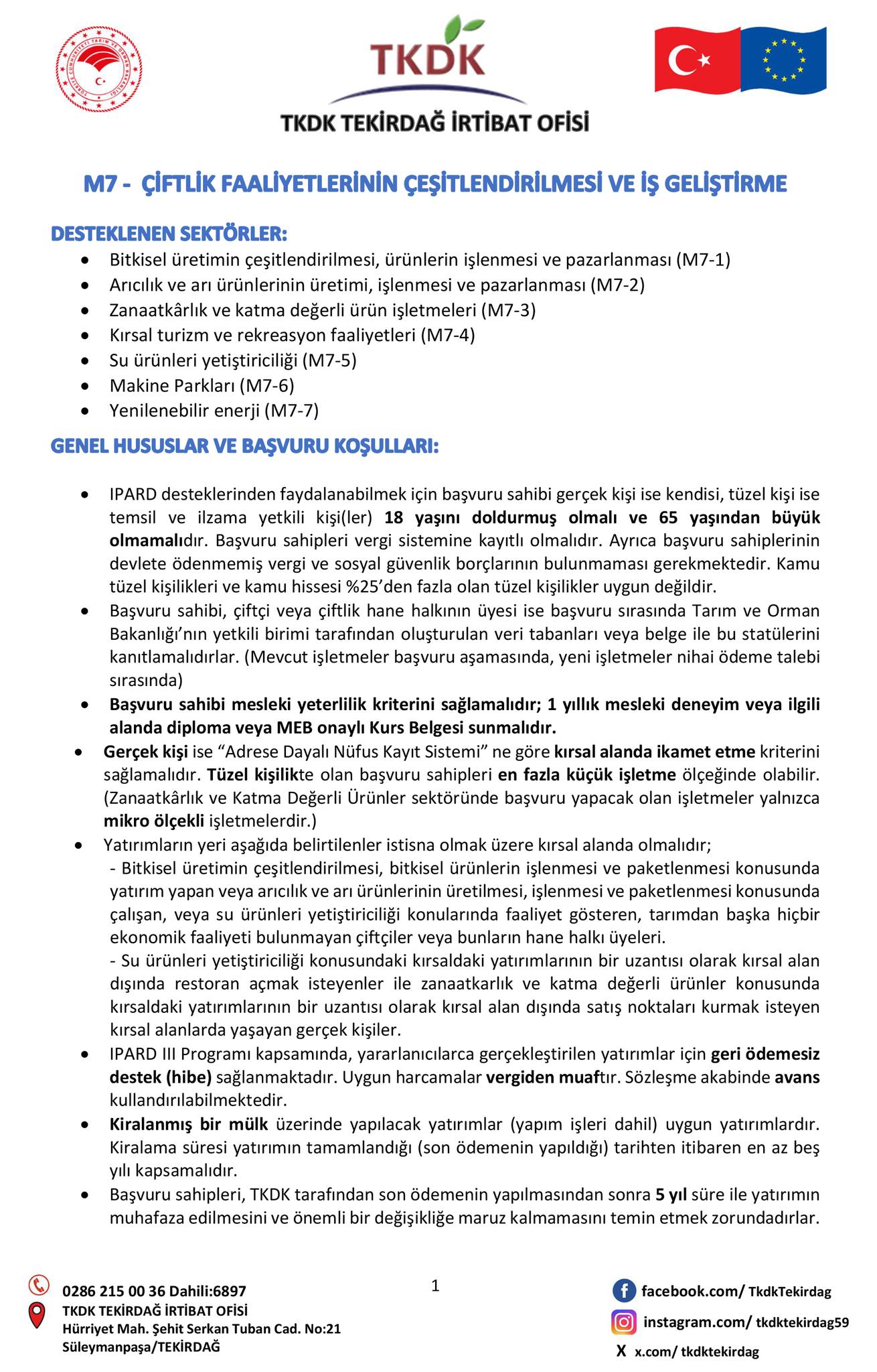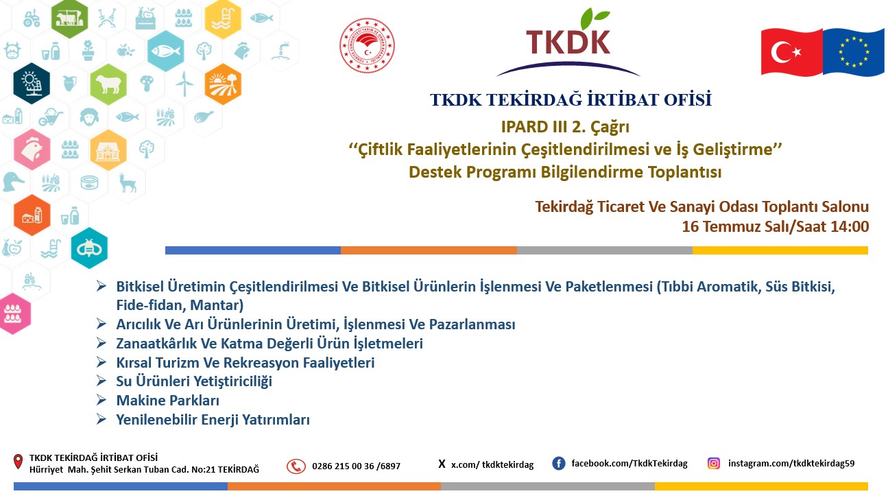 "Çiftçilik Faaliyetlerinin Çeşitlendirilmesi ve İş Geliştirme" Destek Programı Bilgilendirme Toplantısı; 16.07.2024 Salı günü 14:00'te Tekirdağ TSO Konferans Salonu'nda gerçekleşecektir.